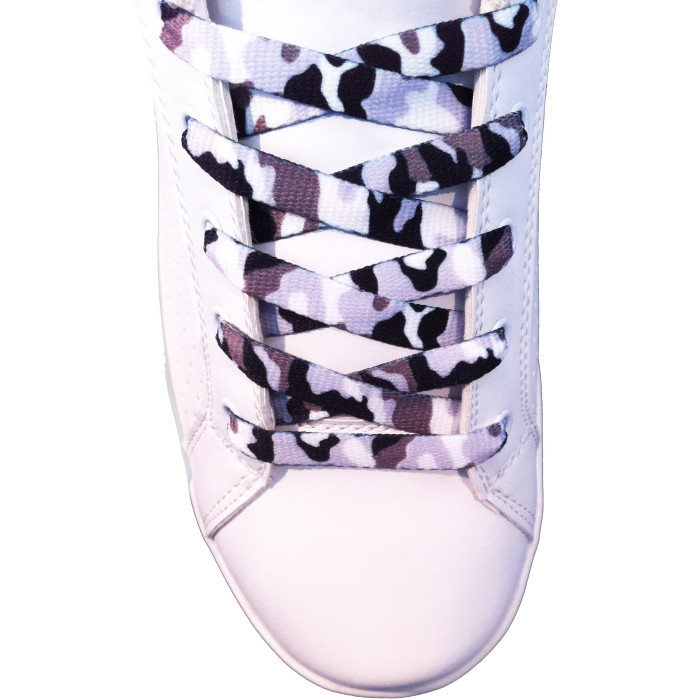 Dit specifieke paar uit onze selectie 10mm veters met een patroon heeft een stoer ontwerp. Deze veters heeft een leger print, maar niet zomaar de standaard print met groen en zwart. Wij hebben voor deze veter gekozen voor een variant met wit, grijs en zwart. Deze drie kleuren vormen een one-of-a-kind paar veters die er werkelijk spectaculair uit ziet!